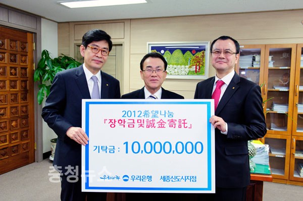 우리은행 세종신도시지점(지점장 이상건)에서 지난 13일 연기군청을 방문해 각각 연기군장학회에 1000만원, 조치원중학교장학회에 500만원, 불우이웃돕기성금으로 500만원 등 총 2000만원을 기탁했다.