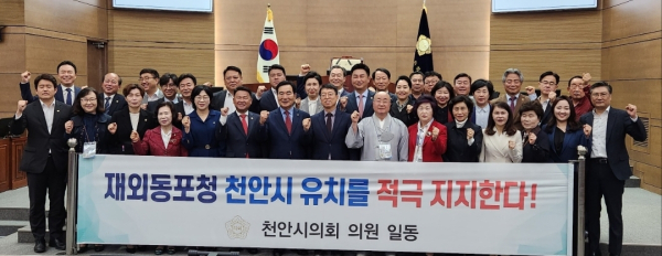 이날 천안시의원 일동은 역사적·지리적 당위성을 바탕으로 6월 신설되는 전 세계 193개국 750만 재외동포의 권익을 책임질 ‘재외동포청’의 천안 유치를 강력히 지지 표명하며 이에 필요한 행정·재정적 지원을 다할 것을 결의했다.