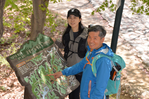 가파른 목재 계단을 만난다. 계단을 오르면 평탄한 길이 이어지고, 제2주차장에서 올라오는 길이 보인다. 등산로는 오르막과 내리막이 반복된다. 주차장에서 1.7km 지점에 도착한다. 오봉산 중간 지점이다. 이곳까지 오르면 건강수명이 1시간 더 연장될 수 있다는 문구에 힘이 솟는다.