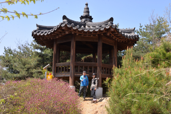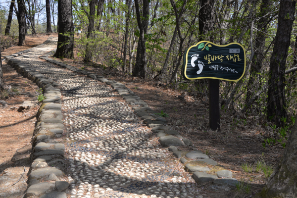 주차장에서 등산로 초입에 진입한다. 초입부터 등산로는 내내 부드러운 황톳길로 이어진다. 울창한 소나무 숲을 마주한다. 상쾌한 솔향기 가득 느껴진다. 이곳 평상이나 정자에서 잠시 쉬면서 몸을 풀고 산행을 시작해도 좋다. 자갈이 박혀 있는 ‘맨발등산지압로’에 눈길이 간다. 이런 지압로는 등산로 중간에 2군데 더 설치되어 있다. 맨발로 이곳을 걸으면 지압 효과가 높다고 한다. 신발을 벗고 한번 맨발로 걸어보자. 가끔씩 맨발로 산행하는 등산객을 만난다.