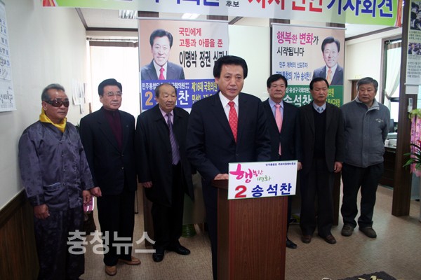 이건우 4대 부의장이 대표로 낭독한 지지선언문에서는 “국민에게 고통과 아픔을 준 이명박 정권과 구태정치, 철새정치에 실망한 국민들이 정치를 바꾸라고 요구한다”며 “시의원, 구청장, 국회의원 역임하면서 경륜과 소신, 강한 추진력을 검증받은 정치인 송석찬은 이 시대에 쉽게 찾아보기 어려운 희망이 아닐 수 없다”고 강조했다.