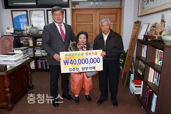 부여읍 구교리에 거주하는 김춘성(79세),양부억예(69세)부부가 지난 23일 오후 가정형편이 어려워 제대로 공부할 수 없는 학생들에게 써 달라며 장학금 4000만원을 굿뜨래 장학재단에 기탁해 왔다.