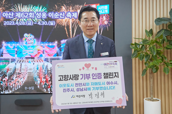 지난 2월 이웃 도시인 천안시, 자매도시인 전남 여수시와 경남 진주시에 고향사랑기부금을 전달했던 박경귀 시장은 이날 이명수 국회의원의 지목을 받아 챌린지에 동참하며경기 성남시에 고향사랑기부금을 전달하고, 다음 기부자로 신상진 성남시장을 지명했다.