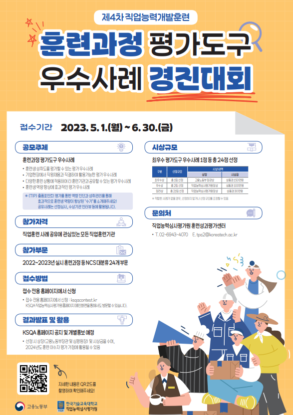 접수된 우수사례는 공정한 심사를 거쳐 최우수상 1팀, 우수상 2팀, 장려상 21팀을 선정해 시상하며, 최우수상 수상기관에는 고용노동부장관상, 우수상과 장려상 수상기관에는 직업능력심사평가원장상이 수여된다.