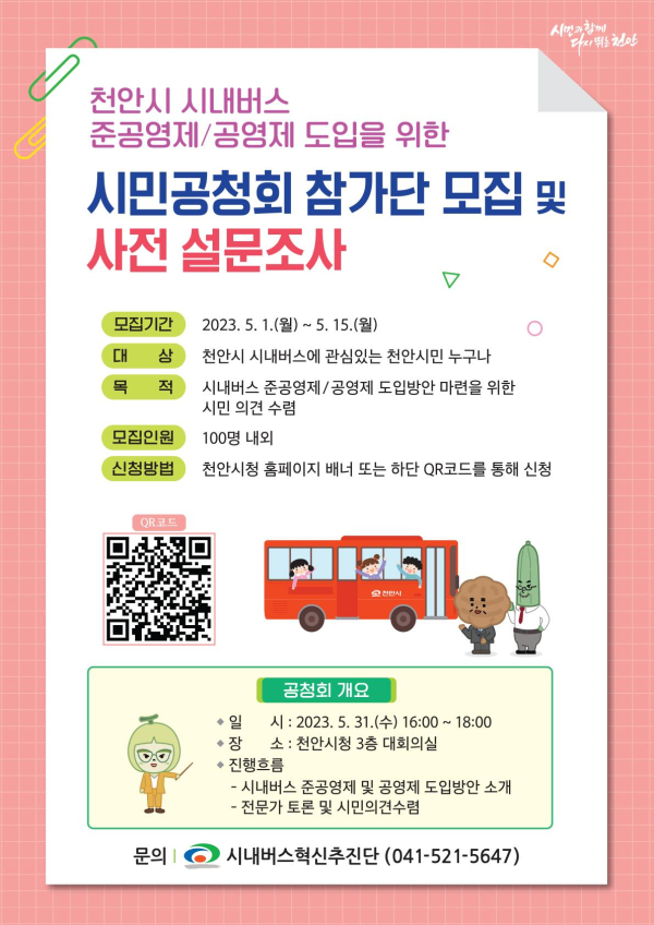 [충청뉴스 박동혁 기자] 충남 천안시는 시내버스 준공영제·공영제 도입을 위한 시민공청회 참가단 모집 및 온라인 사전 설문조사를 실시한다고 1일 밝혔다.