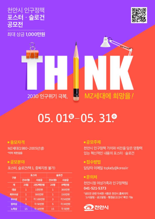 이번 공모전은 지역 제한이 없으며, 천안시 인구정책에 관심 있는 전국 1980~2005년생 MZ세대라면 누구나 참여 가능하다.
