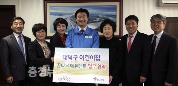 대전 대덕구(구청장 정용기)는 7일 구청 구민의 사랑방에서 함영주 하나은행 대전영업본부부행장보와 백순희, 백은정, 채수완 어린이집 연합회장단과 함께 ‘꿈나무 에듀멘토 업무 협약식’ 을 개최했다.