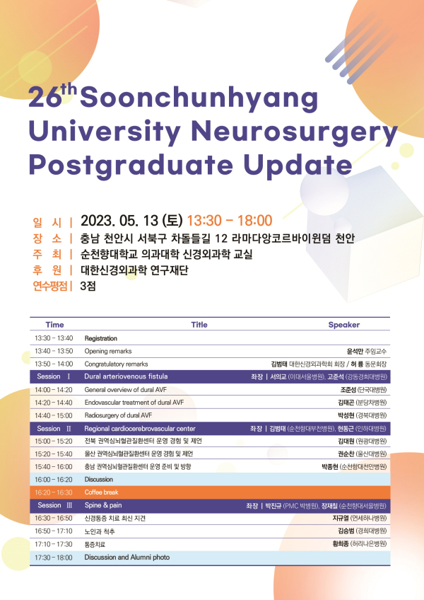 신경외과 윤석만 주임교수는 “이번 강좌에서는 임상에서 관심이 많은 뇌혈관질환과 척추질환, 신경통증 치료에 대한 최신 지견들을 다룬다”며 “개원의들의 많은 관심과 참가를 바란다”고 말했다.