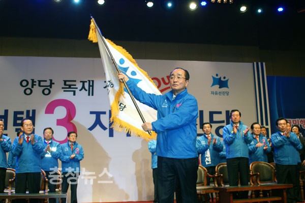 ▲ 심대평 대표가 당기를 흔들고 있다.