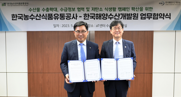 [충청뉴스 최형순 기자] 한국농수산식품유통공사(사장 김춘진)는 18일 서울 양재동 aT센터에서 한국해양수산개발원(원장 김종덕)과 수산물 수출 확대와 수급 정보 협력, 저탄소 식생활 확산을 위한 업무협약을 체결했다.
