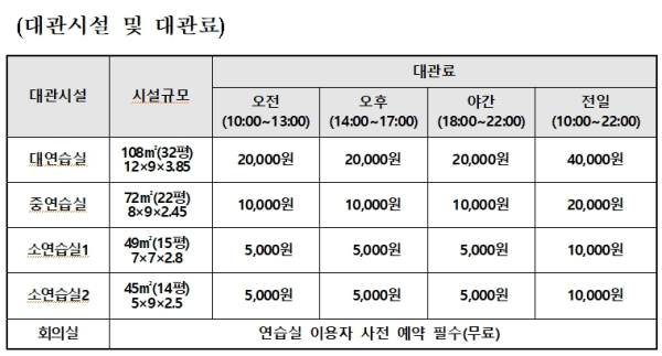 대상시설은 연습실 4개소(대연습실, 중연습실, 소연습실1, 소연습실2)로, 대관기간은 2023년 7월 4일부터 12월 31일까지이다.
