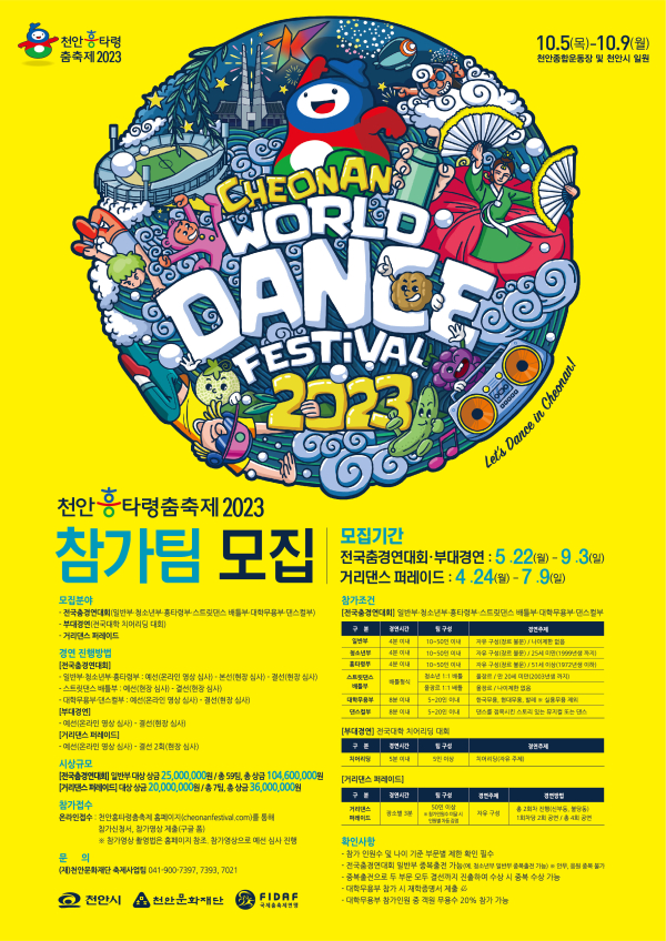 [충청뉴스 박동혁 기자] 천안문화재단은 ‘천안흥타령춤축제 2023’의 춤 경연 대회 참가팀을 모집한다고 22일 밝혔다.
