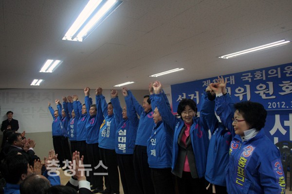 23일 오후 천안 신방동 충남도당 사무실에서 선거대책위원회 출범식에서 심 대표는 "4.11 총선은 어떻게 보면 선진당과 충청의 명운이 걸려있는 선거이기도 하다. 지역, 이념 권력 패권주의에 빠져있는 새누리당과 민주당의 양당 패권정치를 종식시킬 수 있는 유일한 기회가 이번 총선이라고 목소리를 높였다.