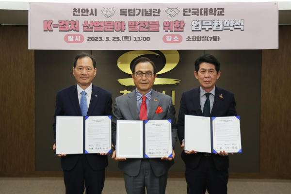 [충청뉴스 박동혁 기자] 충남 천안시는 단국대학교, 독립기념관과 25일 시청 소회의실에서 K-컬처 산업 분야 발전을 위한 업무협약을 체결했다고 밝혔다.