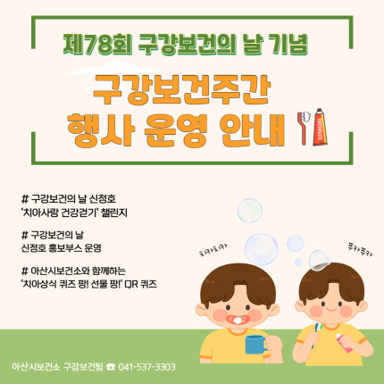 [충청뉴스 박동혁 기자] 충남 아산시는 제78회 구강보건의 날을 맞아 오는 9일부터 23일까지 구강보건 주간행사를 진행한다고 5일 밝혔다.