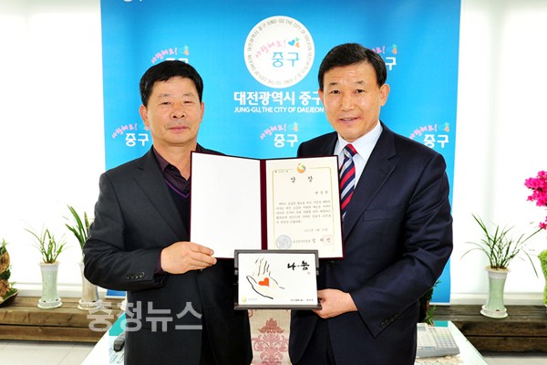 ▲ 박용갑 중구청장이 석교동 복지만두레 현상권 회장에 대한 보건복지부장관 표창장을 전달했다.