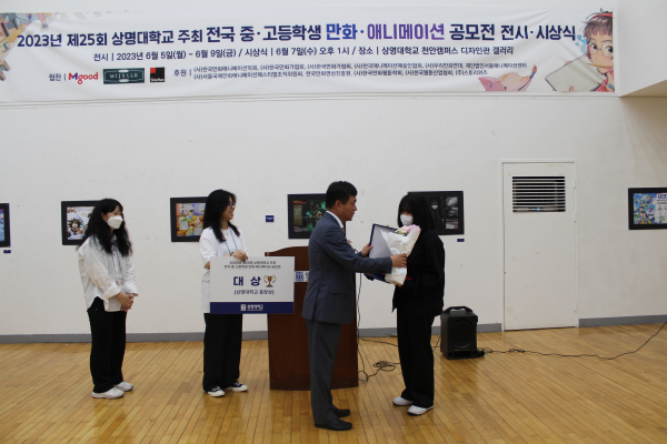 [충청뉴스 박동혁 기자] 상명대학교는 디지털만화영상전공 주관으로 지난 7일 천안캠퍼스에서 ‘제25회 전국 중·고등학생 만화·애니메이션공모전’ 시상식을 개최했다고 밝혔다. 수상 작품들은 오는 9일까지 전시한다.