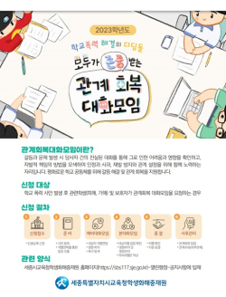 [충청뉴스 최형순 기자] 세종시교육청학생화해중재원은 2023학년도 ‘모두가 존중받는 관계회복 대화모임’ 활성화를 위한 교사용 안내자료를 제작했다.