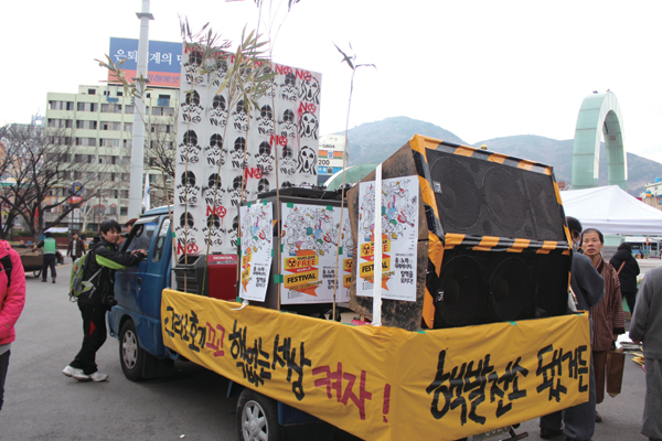 지난번 한진중공업 희망버스를 준비하면서 우리끼리 이런 얘기를 했어요. ‘우리 연봉이 얼마쯤 되겠노?’ ‘한 오백만원 쯤 되겠네’라고요. 연봉 5백만 원인 비주류 문화 노동자가 모여서 한진중공업 해고자 복직 투쟁에 연대에 참여하려고 며칠 밤잠 설치면서 공연준비를 하는 건 우리가 희망하는 삶이 자본의 교환 가치에 좌우되지 않기 때문이에요. 어디에 가치를 두느냐에 따라 삶은 달라진다고 봐요.”