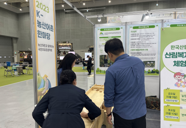 9일 경기 수원시 영텅구 수원컨벤션센터에서 열린 ‘2023 K-농산어촌 한마당’ 한국산림복지진흥원 홍보부스에서 관람객들이 산림복지프로그램을 체험하고 있다.