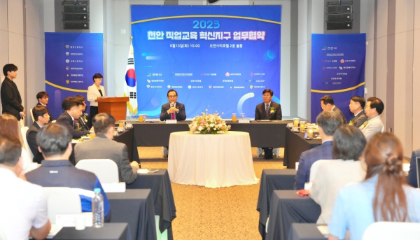 [충청뉴스 박동혁 기자] 충남 천안시는 충청남도천안교육지원청, 7개 지역기업과 지난 13일 오엔시티호텔에서 ‘직업교육 혁신지구 운영을 위한 업무협약’을 체결했다고 밝혔다.
