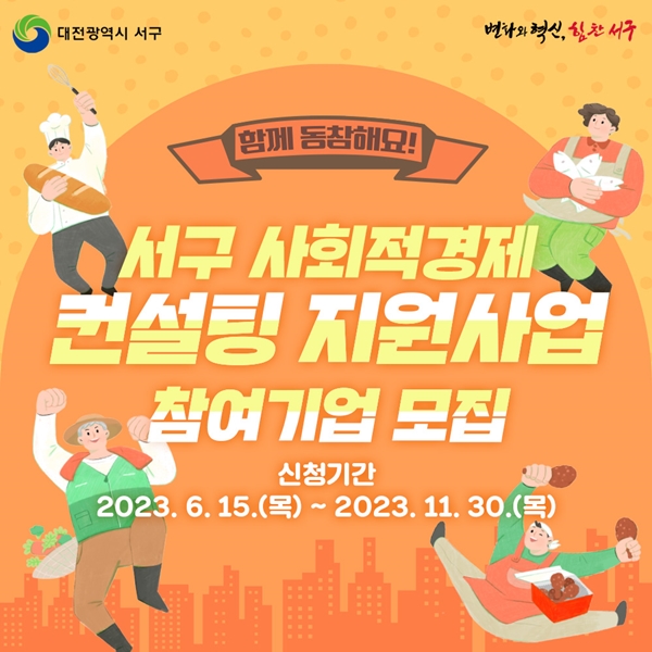 [충청뉴스 김남숙 기자] 대전 서구는 사회적기업 역량 강화와 성장 견인을 위해 사회적경제 컨설팅 지원사업 추진을 위한 참여기업을 모집한다고 19일 밝혔다.