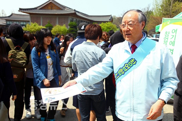 한남대는 김형태 총장을 중심으로 17일 오전 한남대 성지관 앞, 정일규 학생인재개발처장 등이 학생들의 창업을 지원하기 위해 창업지원단과 함께 교내 성지관 앞에서 홍보 캠페인을 벌였다.