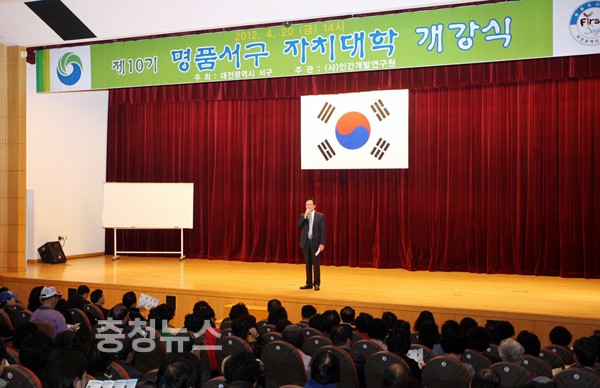 대전시 서구(구청장 박환용)는 지난 20일, 서구청 대강당에서 ‘제10기 명품서구 자치대학’의 개강식을 갖고, 첫 강의로 ‘웃으면 건강해 진다’라는 주제로 코미디언 이용식씨가 출연, 우리 삶의 기초인 건강을 위해 웃으면서 사는 즐겁고 행복한 방법에 대하여 강의를 펼쳐 수강생들의 큰 호응을 얻었다.