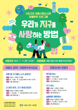 [충청뉴스 최형순 기자] 세종시립도서관은 오는 11일부터 ‘생태·환경’을 주제로 한 여름방학 프로그램인 ‘우리가 지구를 사랑하는 방법’에 참여할 초등학생 70명을 선착순 모집한다.