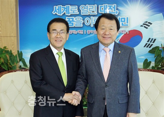 염홍철 대전시장과 유한식 세종시장 당선자가 대전과 세종시의 상생발전을 위해 적극 협력할 것을 다짐했다. 유한식 세종특별자치시장 당선자는 26일 오전 인사차 대전시청을 방문, 염시장을 예방하고“세종시를 국가균형발전의 상징적 명품도시로 만드는데 대전시의 적극적 협조가 절실하다”고 요청했다.