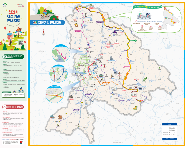 안내지도는 천안시 자전거길 정비현황, 천안8경을 비롯한 자전거길 주변 주요 관광지와 지역 특산물, 국토종주자전거길 투어, 자전거도로 안전주행 수칙, 자전거표지판 알아두기 등 다양한 정보를 담고 있다.