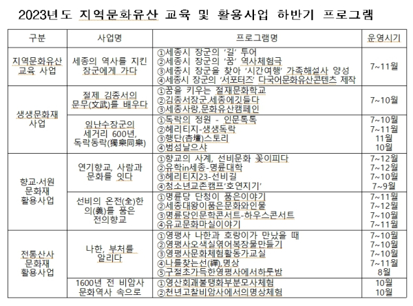 [충청뉴스 최형순 기자] 세종특별자치시(시장 최민호)가 상반기에 이어 하반기에도 시민들을 위한 다양한 문화유산 향유 및 체험 프로그램을 운영한다.