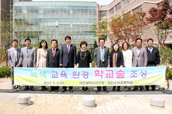 대전광역시 서구(구청장 박환용)는 지난 2일 정림동 수미초등학교에서 학교내 녹지 및 유휴공간을 활용하고 친환경적 녹색공간을 조성하기 위한 ‘학교숲 조성사업 준공식’을 가졌다.