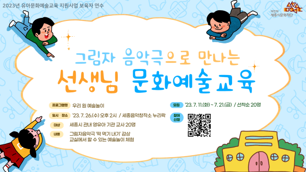 [충청뉴스 최형순 기자] 세종시문화재단(대표이사 김종률)은 오는 26일 박연문화관 지하 2층 누리락 공연장에서 영유아 시설 교사들을 위한 문화예술교육 연수를 진행한다.