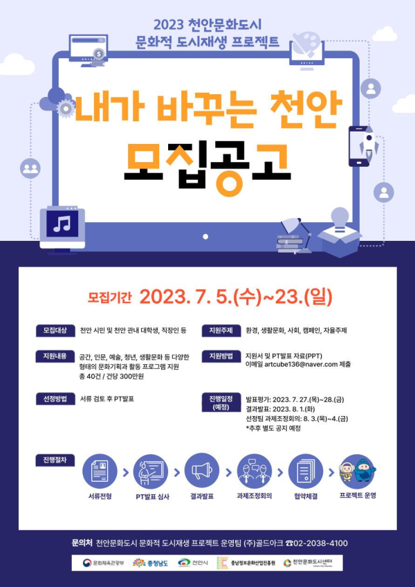 [충청뉴스 박동혁 기자] 충남정보문화산업진흥원 문화도시사무국은 천안시와 ‘2023 문화적 도시재생 프로젝트 내가 바꾸는 천안’ 참여자를 모집한다고 13일 밝혔다.