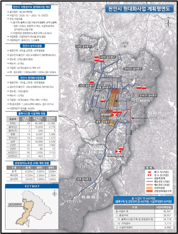 환경부는 2020년 252억원을 투입해 천안시 급수체계 현대화를 추진하려 했으나, 천안시의 급수계통 특수성으로 인해 사전기술 검토가 지연되면서 2022년 12월 검토 결과를 발표했다.