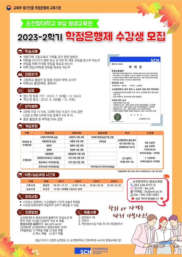 학점은행제 등록 기간은 내달 16일까지이며, 순천향대 평생교육원 홈페이지 공지사항을 통해 모집 관련 상세 내용을 확인할 수 있다.