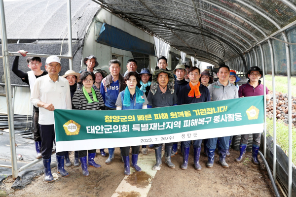 제9대 태안군의회는 지난 26일 집중호우로 인해 수해를 입은 청양군 청남면왕진리를 찾아 수해지역 복구 봉사활동을 실시했다