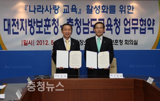 충남교육청(교육감 김종성)은 16일 오전 10시 30분 대전지방보훈청 대회의실에서 대전지방보훈청(청장 신영교)과 청소년들의 올바른 국가관 확립과 나라사랑 정신 함양을 위한 업무협약을 체결했다.