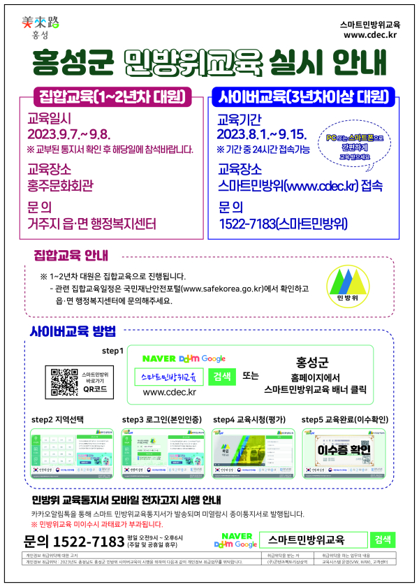 [충청뉴스 권상재 기자] 홍성군은 상반기 기본교육 미이수한 3년 차 이상 민방위 대원 대상으로 오는 1일부터 9월 15일까지 하반기 민방위 보충1차 사이버 교육을 실시한다.