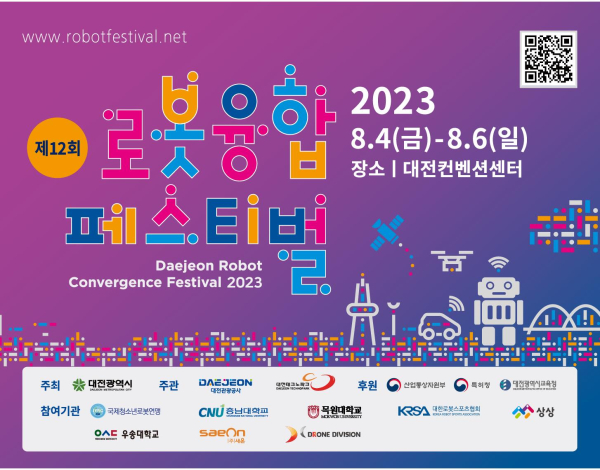 ‘로봇융합 페스티벌’은 충남대학교, 목원대학교, 우송대학교 등 지역대학의 로봇공학과와 산학협력단을 비롯해 대한 로봇 스포츠협회, 국제 청소년 로봇 연맹 등 관계 기관, 지역 기업인 ㈜새온, ㈜상상, ㈜드론디비전 등 8개 기관이 참여해 28분야 48부문의 경진대회를 운영한다.