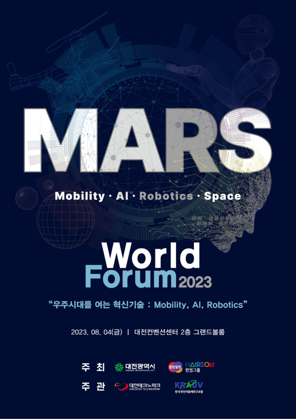 [충청뉴스 김용우 기자] 대전시는 2023년 제3회 마스(MARS)월드 포럼을 4일 대전컨벤션센터에서 개최한다. MARS는 Mobility(모빌리티), AI(인공지능), Robotics(로봇), Space(우주)의 약어다.