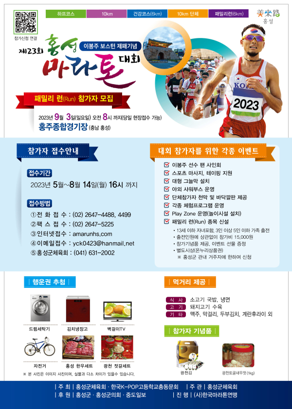 홍성군과 한국K-POP고등학교총동문회, 중도일보가 공동 주최하고 홍성군체육회에서 주관하는 이번 대회는 ▲하프코스(21.09km) ▲단축코스(10km) ▲건강코스(6km) ▲단체전(10km) ▲패밀리런(6km)으로 진행된다.