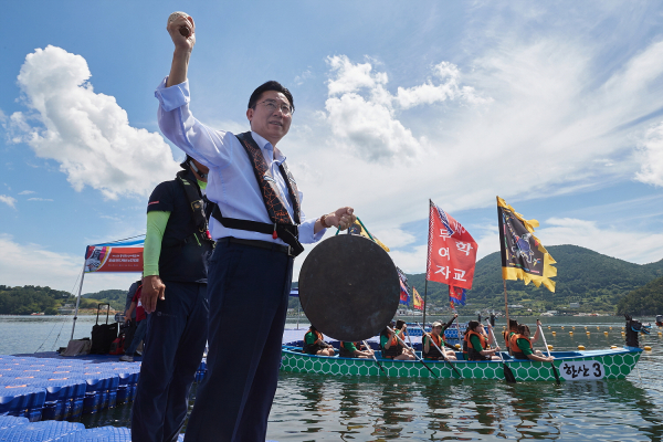 '거북선 노젓기 대회’에서 출발 신호로 징을 치는 박경귀 시장/아산시 제공