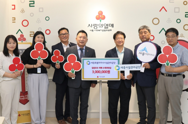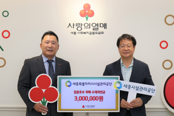 [충청뉴스 최형순 기자] 세종특별자치시시설관리공단(이사장 조소연, 이하 공단)은 7일 관내 집중호우로 피해를 입은 이웃을 위해 재난극복지원 수재의연금 300만 원을 세종사회복지공동모금회에 전달했다.