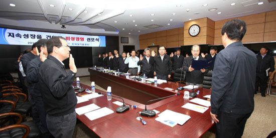 한국농어촌공사(사장 박재순)가 21일, 경기 의왕시 본사에서 농산물 수입 확대와 이상기후 등으로 위기에 처한 우리 농어촌의 지속성장을 이끌어내기 위한 6가지 핵심 과제를 선정하는 '비상(飛上)경영체제 구축 선포식'을 개최했다.