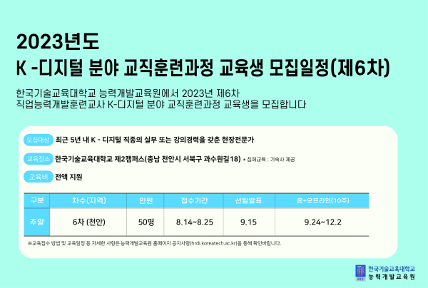 [충청뉴스 박동혁 기자] 한국기술교육대학교 부설 능력개발교육원은 ‘K-디지털 분야 교직훈련과정’ 교육생을 모집한다고 11일 밝혔다.