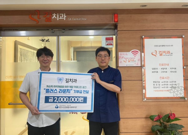 [충청뉴스 최형순 기자] 길 치과는 11일 천안시 성정종합사회복지관(관장 함호영)에 1인 가구 및 사회적 소외계층을 위한 ‘복합커뮤니티 공간‘플러스 라운지 조성사업’ 후원금 전달식을 가졌다.