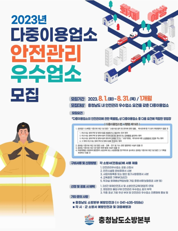[충청뉴스 박동혁 기자] 천안동남소방서는 관내 다중이용업소를 대상으로 오는 31일까지 안전관리 우수업소 신청·접수를 받는다고 14일 밝혔다.