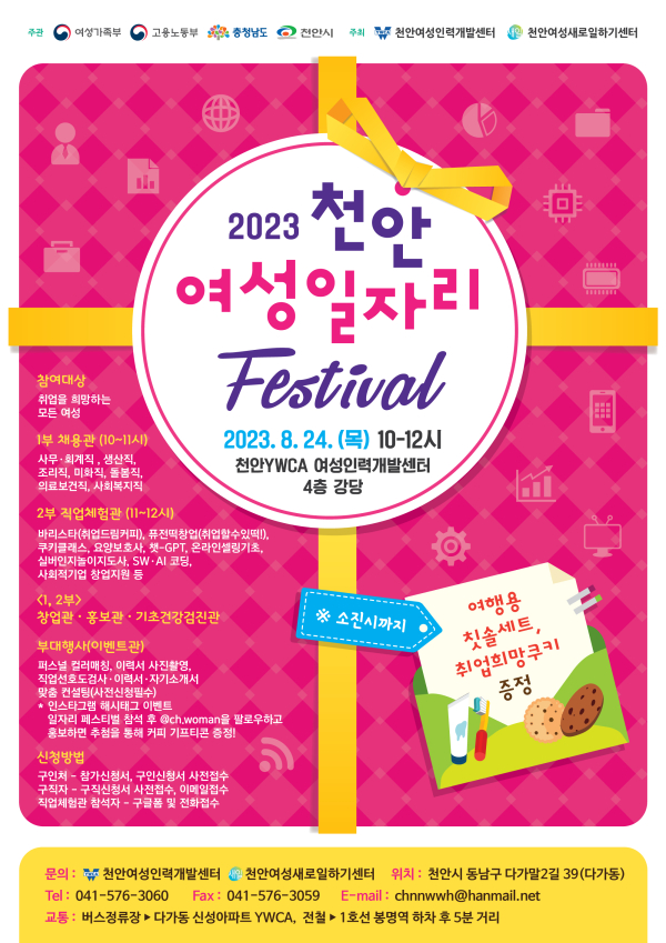 [충청뉴스 박동혁 기자] ‘천안여성 일자리 페스티벌’이 오는 24일 오전 10시부터 12시까지 천안YWCA여성인력개발센터에서 개최된다.